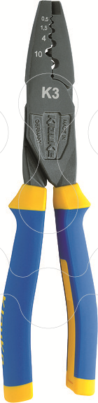 Alicate manual de cravação K3 da Klauke.Cravação por punção de ponteiras dos 0,5 aos 16 mm2 de secção.Prático, inclui descarnador na ponta e marcação no alicate das diferentes secções de cravação no alicate. Opcional, SK32L: Mala de Aço