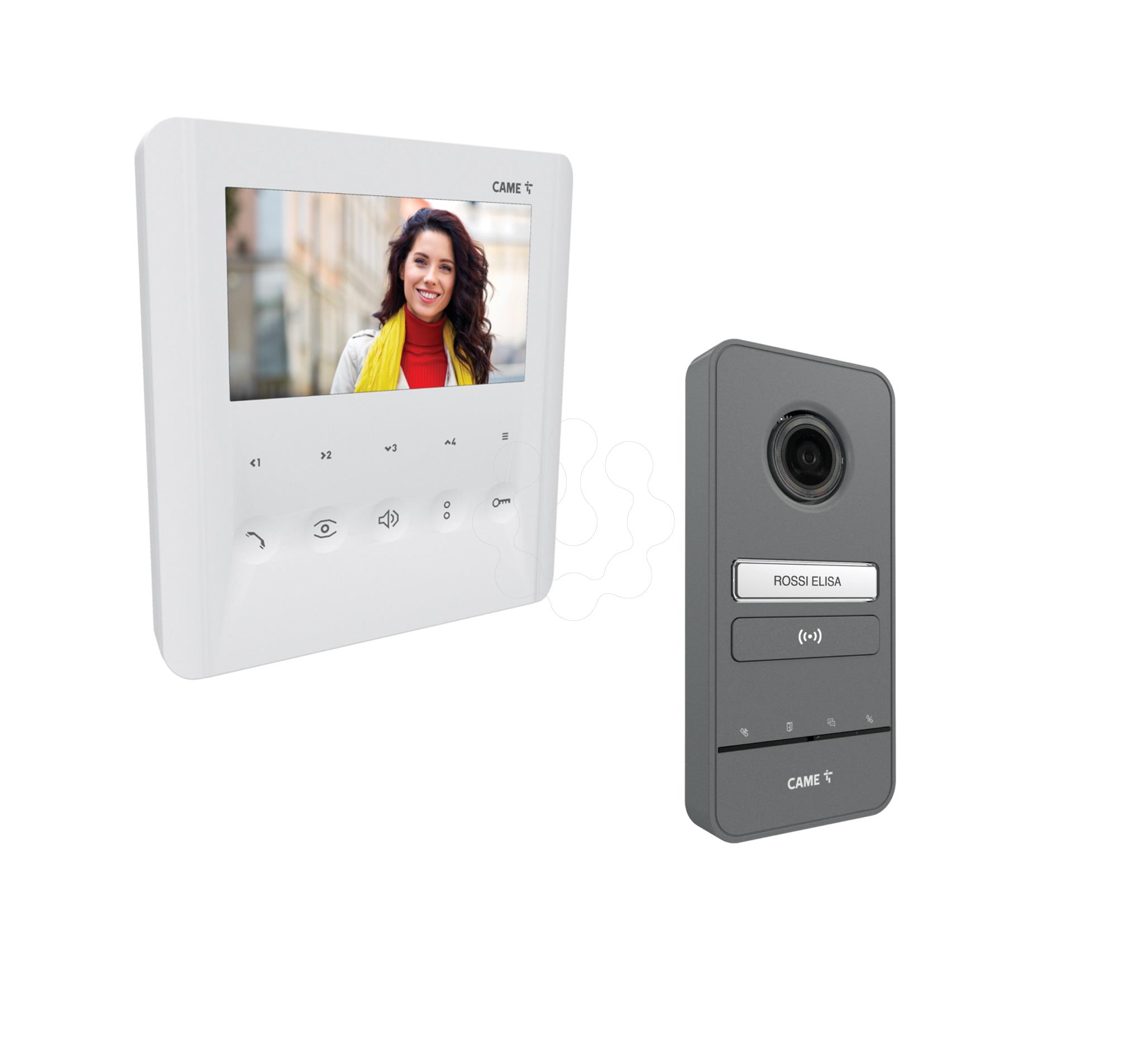 Sistema de videoporteiro mãos-livres com botões de toque suave, ecrã LCD de 5", 4 botões para chamadas de intercomunicação ou comandos auxiliares, branco. Monitor de parede com ecrã LCD a cores de 5? equipado com OSD para ajustar os parâmetros de vídeo (brilho, cor, contraste). Os 5 botões tácteis principais são utilizados para gerir as funções primárias, tais como atender e desligar a comunicação, abertura da porta, auto-inserção de vídeos da placa de entrada, ajuste/exclusão do toque (com LED de sinalização quando excluído) e o envio de um comando auxiliar programável.